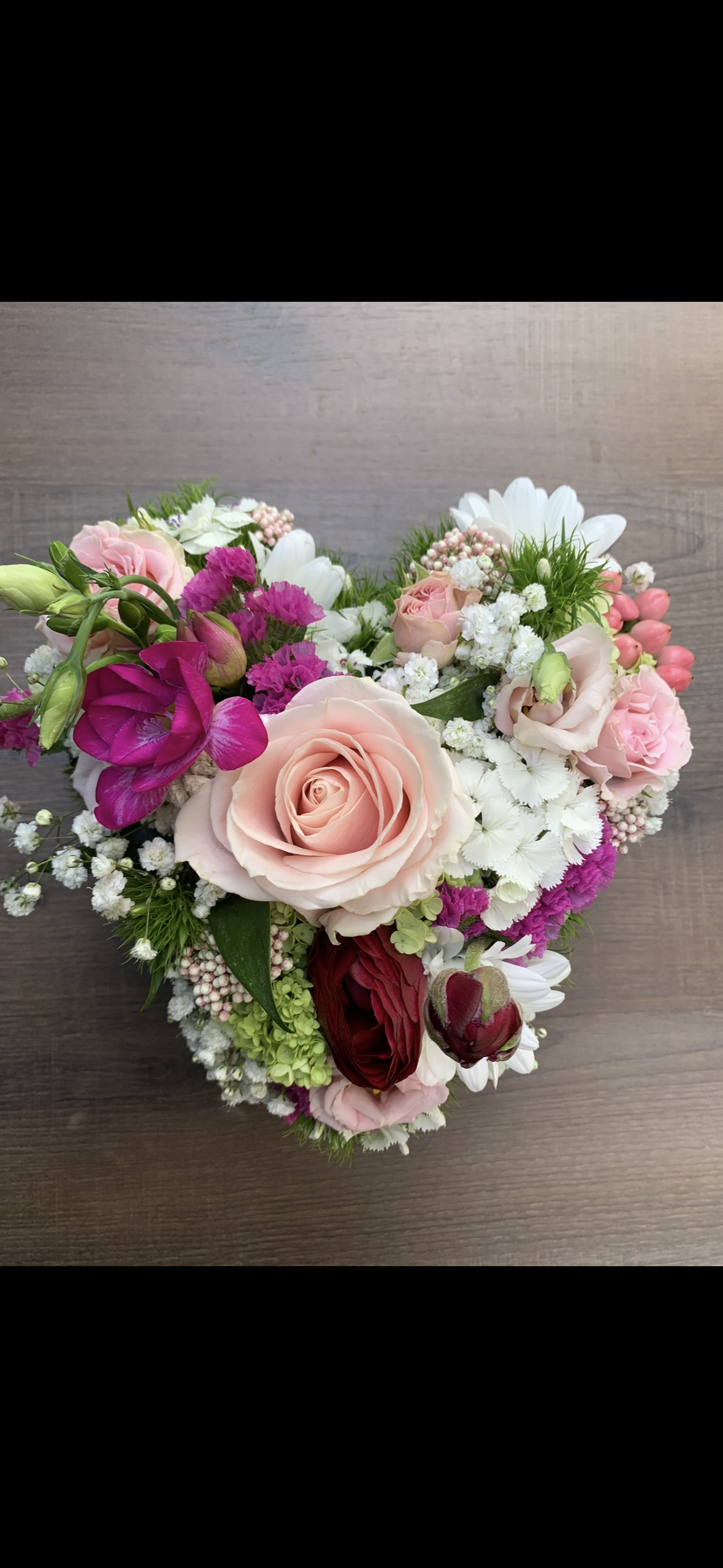 Venez partager un moment créatif afin de réaliser votre arrangement « Coeur avec fleurs fraiches », dans une base en forme de coeur avec des verdures et fleurs fraîches.