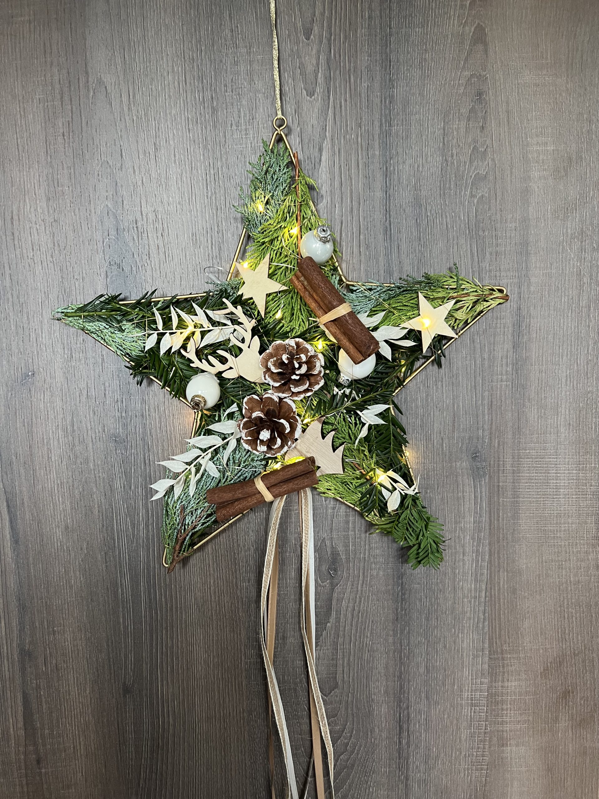Une étoile en métal recouverte de verdures hivernales et des décorations de Noël, rubans et une lumière led.